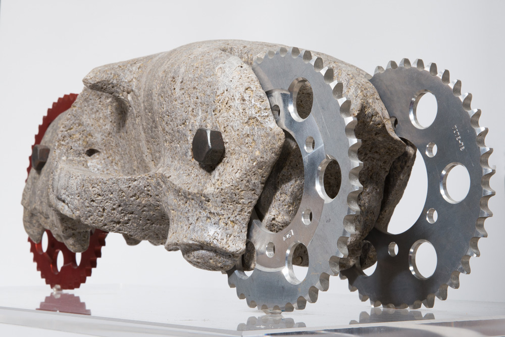 Wie formt nun Königer den Gestaltwechsel aus, was verändert sich? Einige Werkbeispiele: In den „Schädel junger Rehbock“ (2017) sind Hand- bzw. Stellräder integriert, die diesen partiell zu zerteilen und andererseits fahrbar zu machen scheinen; der Raubtierschädel (2017) ist mit Zahnrädern versehen. Der Unterschied zu älteren Werken ist offensichtlich; zu den Knochen, heißt zum Organischen, kommt das Artefakt hinzu, vom Menschen gefertigt aus Stahl. Auf den zweiten Blick ergeben sich jedoch Fragen – was genau stellen die Skulpturen dar? Eine nachvollziehbare Zweckorientierung scheidet aus. Gibt es etwa gar keine Zweckorientierung? Oder ist gerade die Zwecklosigkeit der Sinn? Noch bevor man mögliche Antworten überhaupt gefunden, geschweige sich denn für eine bestimmte Antwort entschieden hätte, frappiert uns der Künstler. Der „Hechtkiefer“ trifft Gotik (2020), aber ohne Artefakt, und Karner II (2020) hat nur ein Zitat dabei – nichts Dingliches jedenfalls.